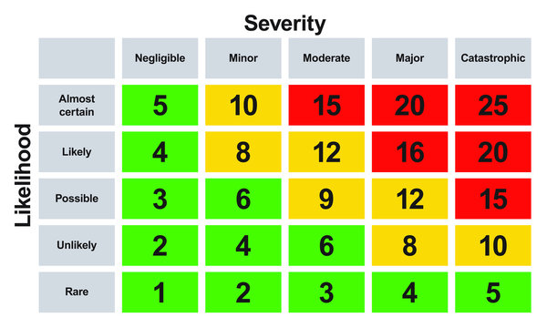 - Evaluación de riesgos: Una vez identificados los riesgos, se procede a su evaluación para conocer el impacto potencial sobre la organización. Es muy importante que todos los riesgos se evalúen de la misma manera, siguiendo el mismo baremo para poder comparar entre ellos. Las herramientas de evaluación de riesgos, como las matrices de riesgos y los árboles de fallas, pueden ayudar a las organizaciones a visualizar y cuantificar los riesgos. En este paso es muy utilizada la matriz de riesgos. Se trata de una tabla donde se define la importancia del riesgo, teniendo en cuenta posibilidad de que ocurra frente a la gravedad de sus consecuencias. Cada organización debe definir qué es para ella cada valor, por ejemplo, una posibilidad baja se puede definir como «que ocurra una vez cada 10 años». Teniendo las definiciones de cada nivel, conseguiremos una evaluación más homogénea a lo largo de los riesgos.
