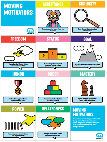 To achieve this knowledge, we can rely on a practice called “Moving motivators”. To perform it we have several cards with different intrinsic motivators and the exercise would consist of three phases: