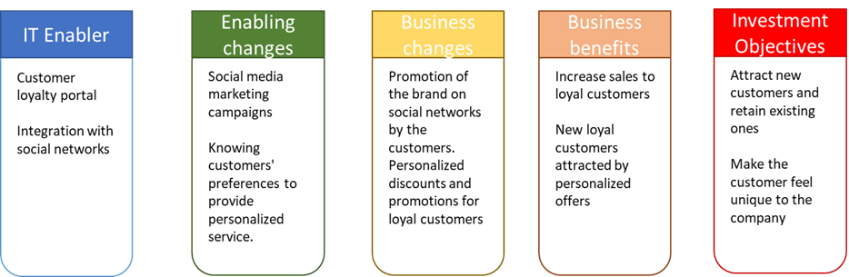 In the example shown above, we see from left to right, the IT enablers that will create a change in the process, this change will in turn create a change in the business, from which it is expected that benefits will be obtained, and these will be aligned with the strategic objectives of the organization. Although it is painted in this way, the way to work this framework is from right to left, looking at the objectives we have to meet, what benefits we need to meet these objectives, knowing the levers of change that are needed in the business, analyzing the changes that need to be made in the processes to achieve the change in the business and, finally, what technologies I can use to achieve this change I need in the process. In this way, we can ensure that IT investments will be aligned with the organization’s objectives, since they are made with their achievement in mind.