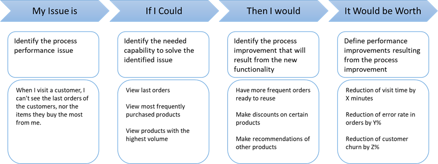 - Quantifiable: when we have evidence that there will be improvements in some of the metrics currently measured by the organization, and that will possibly translate into a financial value; for example, adding a routing system to travel fewer kilometers in transportation systems, will offer a future benefit by reducing computed kilometers (lower fuel costs and less wear and tear on vehicles).