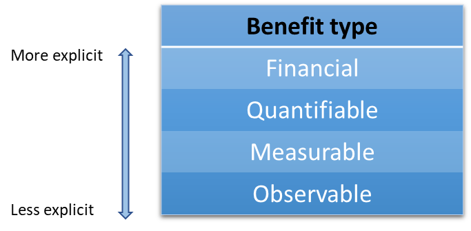 Not all benefits are equal or equally comparable and measurable. For example, if we consider their level of explicitness, we could classify them as follows: