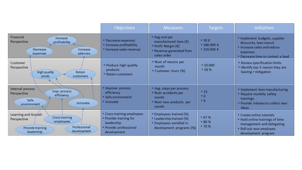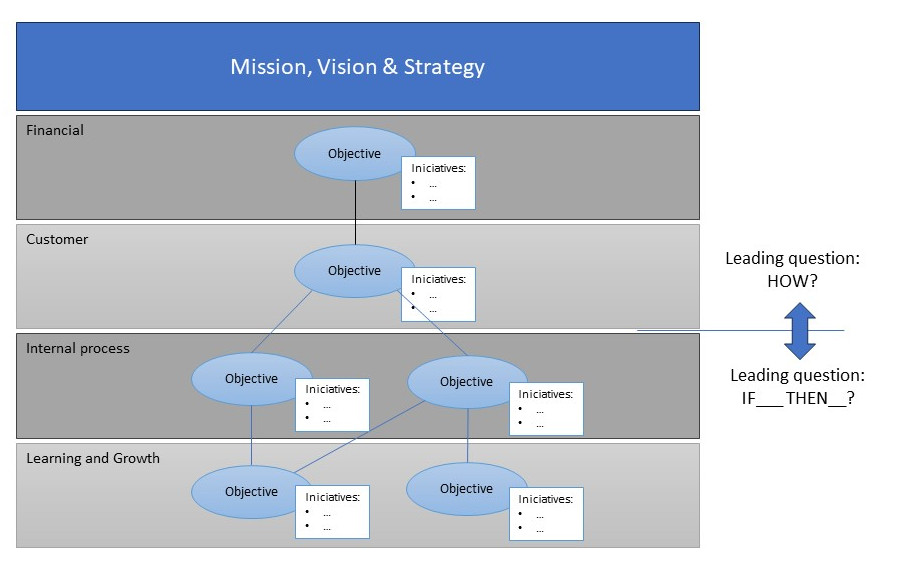 - Creation of the Strategy Map that helps us to visually represent the BSC objectives and their cause-effect interrelationships.