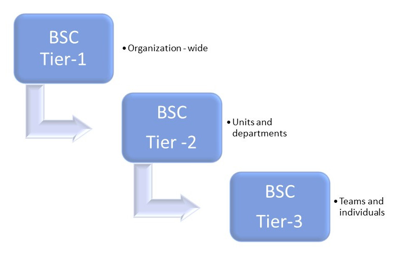 The BSC must be made extensible to the entire organization in a top-bottom approach, this is called “cascading”. To cascade the BSC is to move the company scorecard (sometimes called Tier 1) to the first level of business units or departments (Tier 2) and then to teams or individuals (Tier 3).
