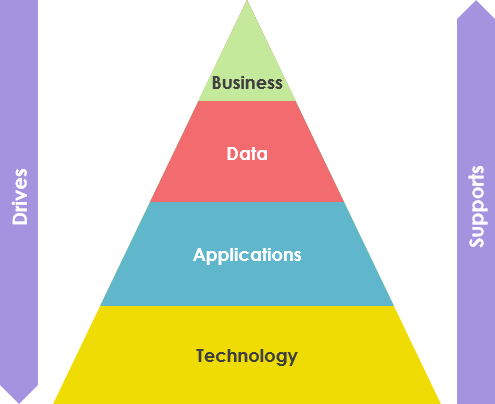 The domains are related, starting from the business domain and ending at the technology domain, with the lower domains building on the higher ones. If I don’t understand how my business operates, I won’t know what information I should be dealing with, and therefore won’t know which applications and technology are best. Focusing only on the application and technology domains is like packing your suitcase without knowing where you are going, what you are going to do, or for how long. Maybe you’ll get it right, but it’s not likely.
